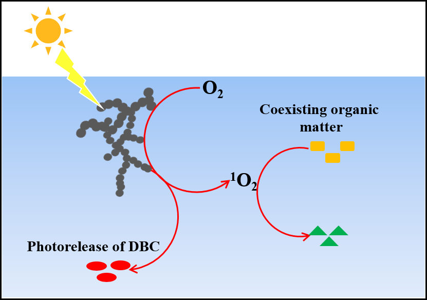 The photochemical aging of soot in the aqueous phase could have an important influence on water environments such as fog water and wet aerosols in the atmosphere, as well as lakes and oceans. In this study, we systematically investigated the photochemistry of soot in the aqueous phase. Soot releases dissolved black carbon into the aqueous phase during photoreactions, which is attributed to the phototransformation of the nonpolar unsaturated C-H species in soot to polar carbonyl-containing species. More importantly, we found that soot suspensions, particularly those of the dissolved part of soot, were effective photosensitizers for the generation of singlet oxygen (1O2). The 1O2 apparent quantum yield of the dissolved part reached 33 ± 2% under 377 nm irradiation, which is an order of magnitude higher than those of most types of well-studied dissolved organic matter in water. As a result, soot could impact the environmental fate of coexisting organic contaminants, such as the photodegradation of bisphenol A. This study will not only give insight into the photochemistry of soot in the liquid phase but also reveal the significant implications of soot photoaging in the aqueous phase by the release and degradation of organic matter. (Environmental Science & Technology, 2019, DOI:10.1021/acs.est.9b02773)