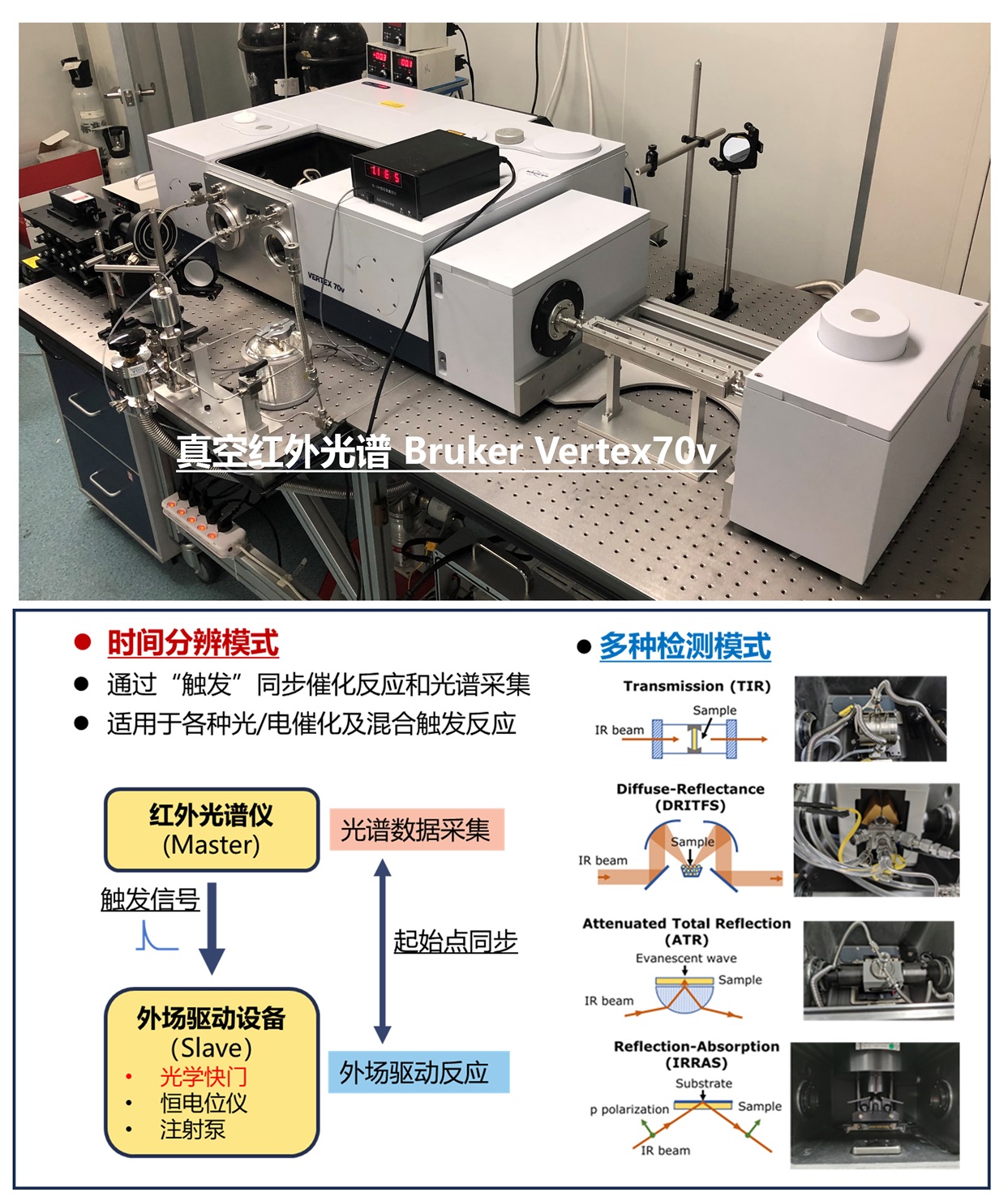 3. 原位红外光谱系统的搭建和方法学发展:通过发展契合表面反应时间尺度(毫秒~秒)、多检测模式的红外光谱仪器和方法学,揭示光/电催化反应过程的微观机制。