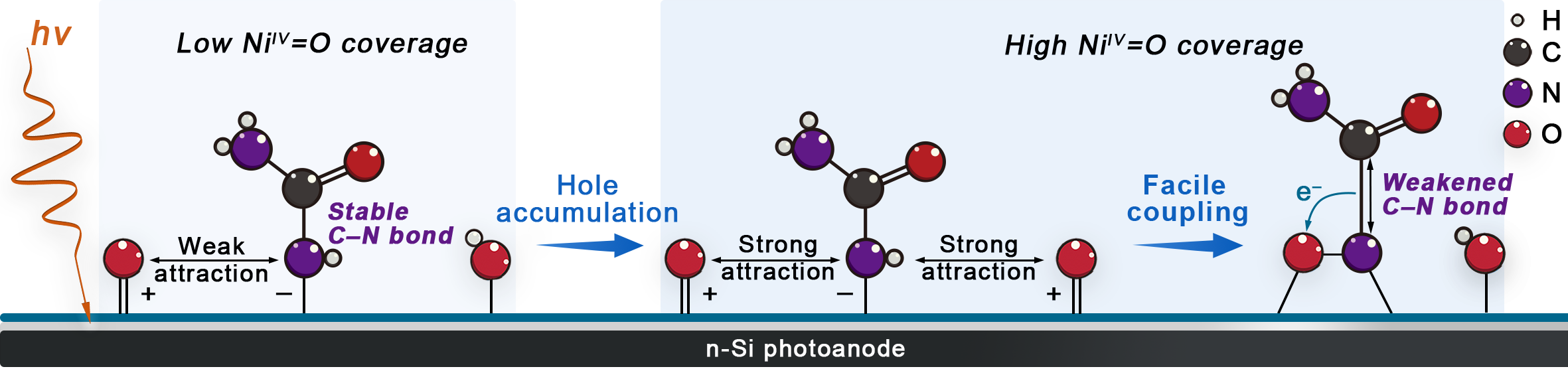 1. 可见光驱动的光电催化:包括水氧化、有机分子转化等反应及相关的质子耦合电荷转移机理,主要基于半导体光催化剂和等离激元金属光催化剂。