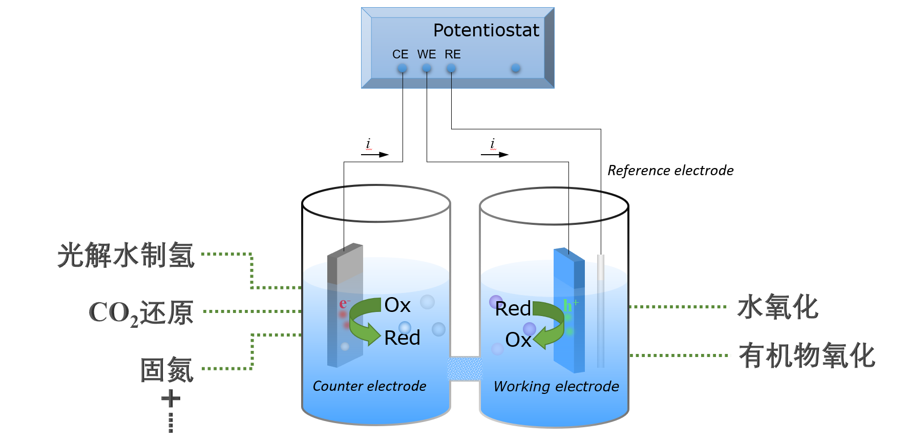 3. 人工光合成体系搭建:结合光阳极(水氧化、有机分子转化)与光阴极(产氢、CO2还原、N2还原等)构建人工光合成体系。
